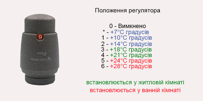 Термостатична голівка як працює. При включенні опалення головка ставиться на розподіл максимальної температури. Після прогрівання приміщення, з метою економії теплової енергії та створення комфортної температури, головка переводиться на бажану температуру. Обертаючи верхню частину головки, сильфон стискається або розтискається, що призводить до зміни реакції на температуру в приміщенні.