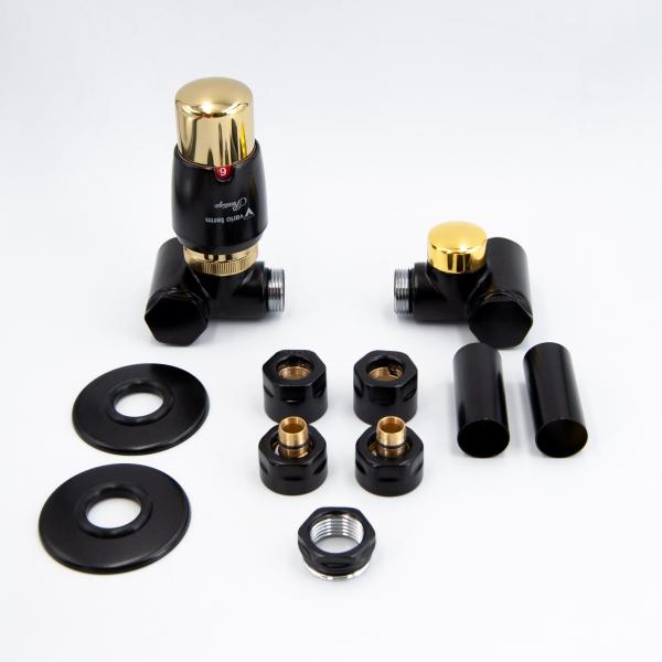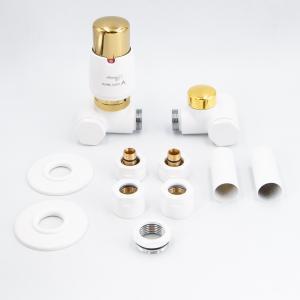 У комплект входить термостатична головка "Prestige", термостатичний клапан (лівий або правий), запірний клапан (лівий або правий), дві одинарні круглі або квадратні маскувальні розетки*, дві маскувальні втулки та два адаптери/з'єднувачі для PEX чи Cu.