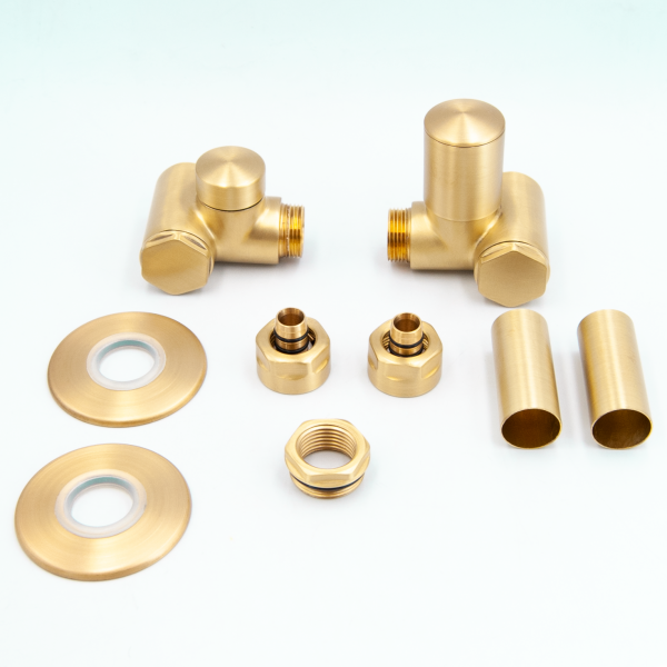 У комплект входить термостатична головка "Prestige", термостатичний клапан (лівий або правий), запірний клапан (лівий або правий), дві одинарні круглі або квадратні маскувальні розетки*, дві маскувальні втулки та два адаптери/з'єднувачі для PEX чи Cu.